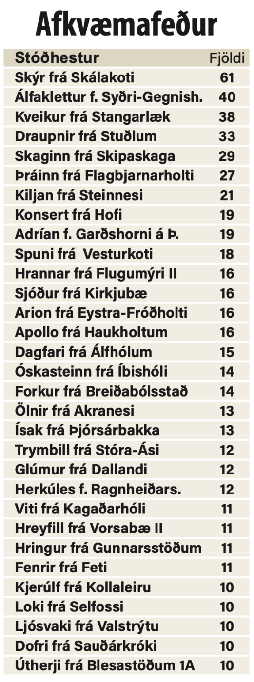 Alls voru 288 feður að baki sýndra hrossa í ár og í meðfylgjandi töflu er listi yfir þá hesta sem áttu tíu eða fleiri sýnd afkvæmi sem komu til dóms: