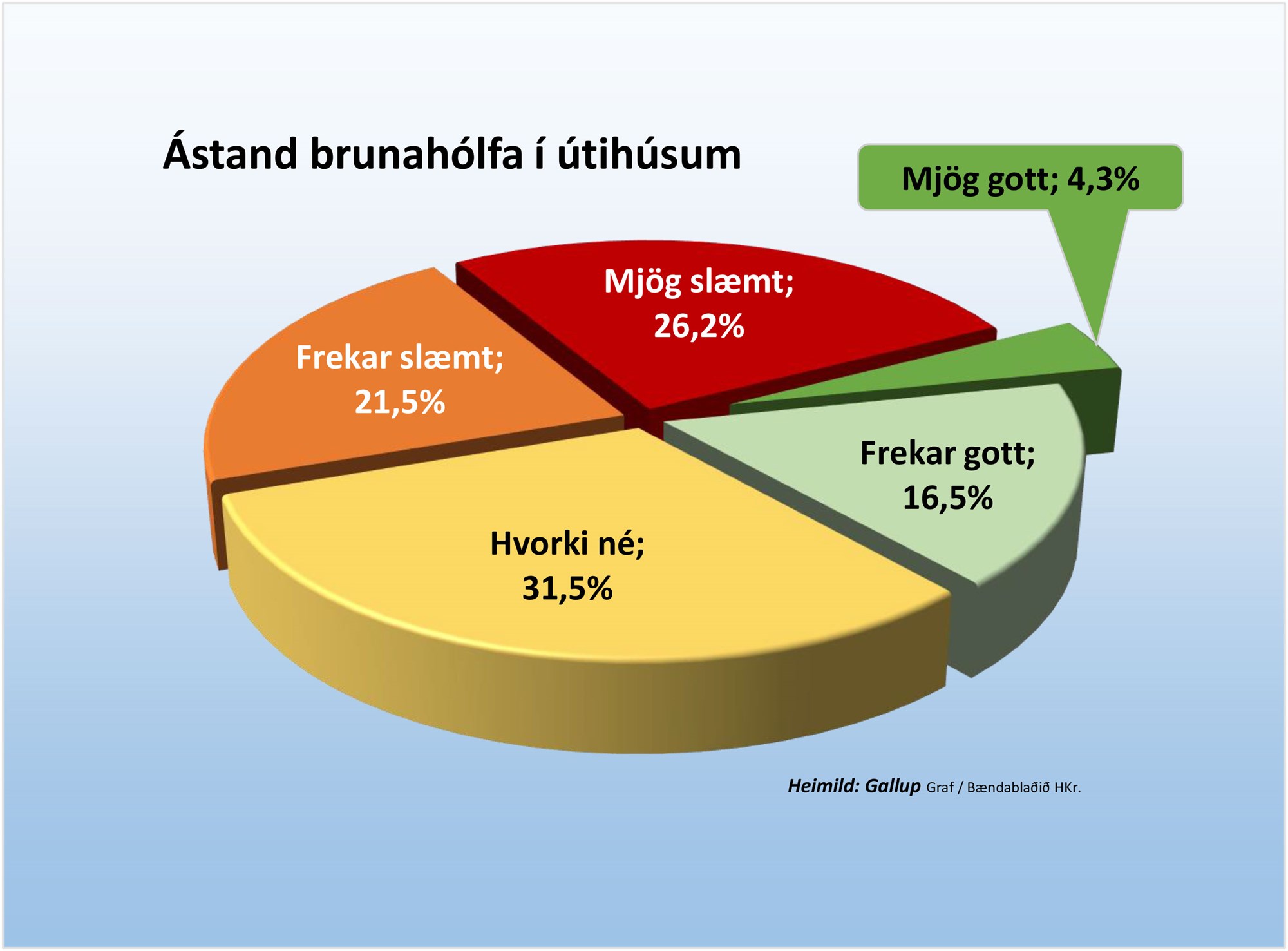 Sé litið til ástands brunahólfunar segir um fimmtungur að það sé frekar eða mjög gott en nærri helmingur, 47,7 prósent, segir það frekar eða mjög slæmt. Áberandi er að ástand brunahólfunar virðist vera mun verra á Vesturlandi/Vestfjörðum og á Austurlandi en í öðrum landshlutum. Brunahólfun getur ráðið miklu í baráttu slökkviliða við útbreiðslu elds og því mikilvægt að hún sé í lagi.