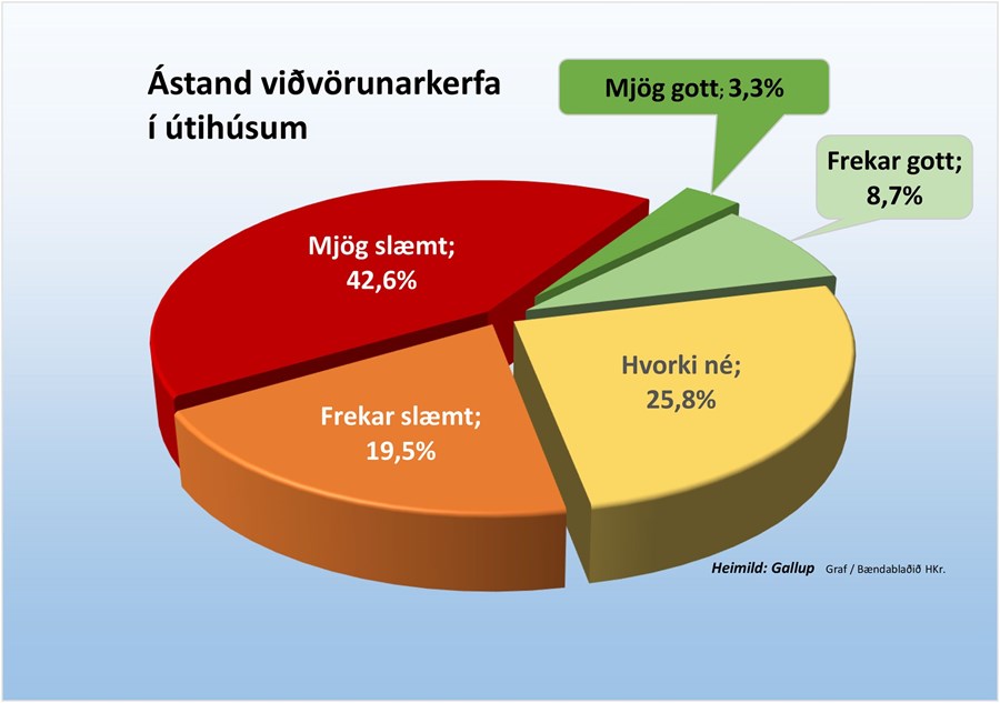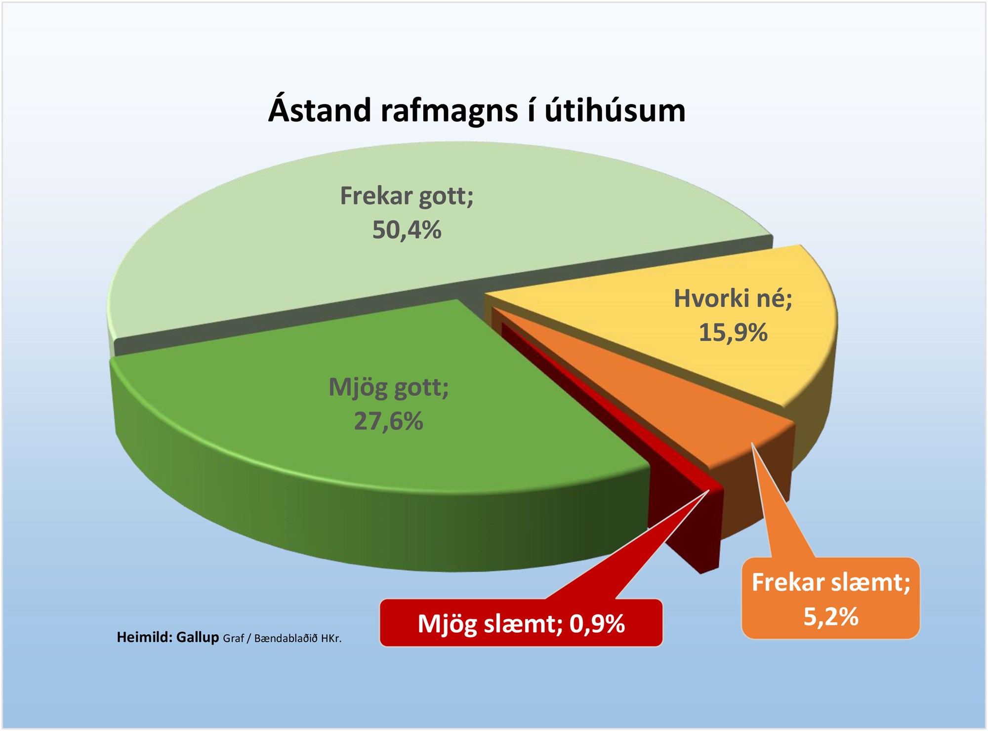 Loks var spurt um ástand rafmagns í útihúsum, en rafmagn er ein algengasta orsök eldsvoða hér á landi. Þá bregður svo við að 27,6 prósent telja ástand rafmagns mjög gott og önnur 50,4 prósent segja það frekar gott, eða samtals 78 prósent. Aðeins 5,2 prósent segja ástand rafmagns í útihúsum frekar slæmt og aðeins örfáir svara að það sé mjög slæmt.