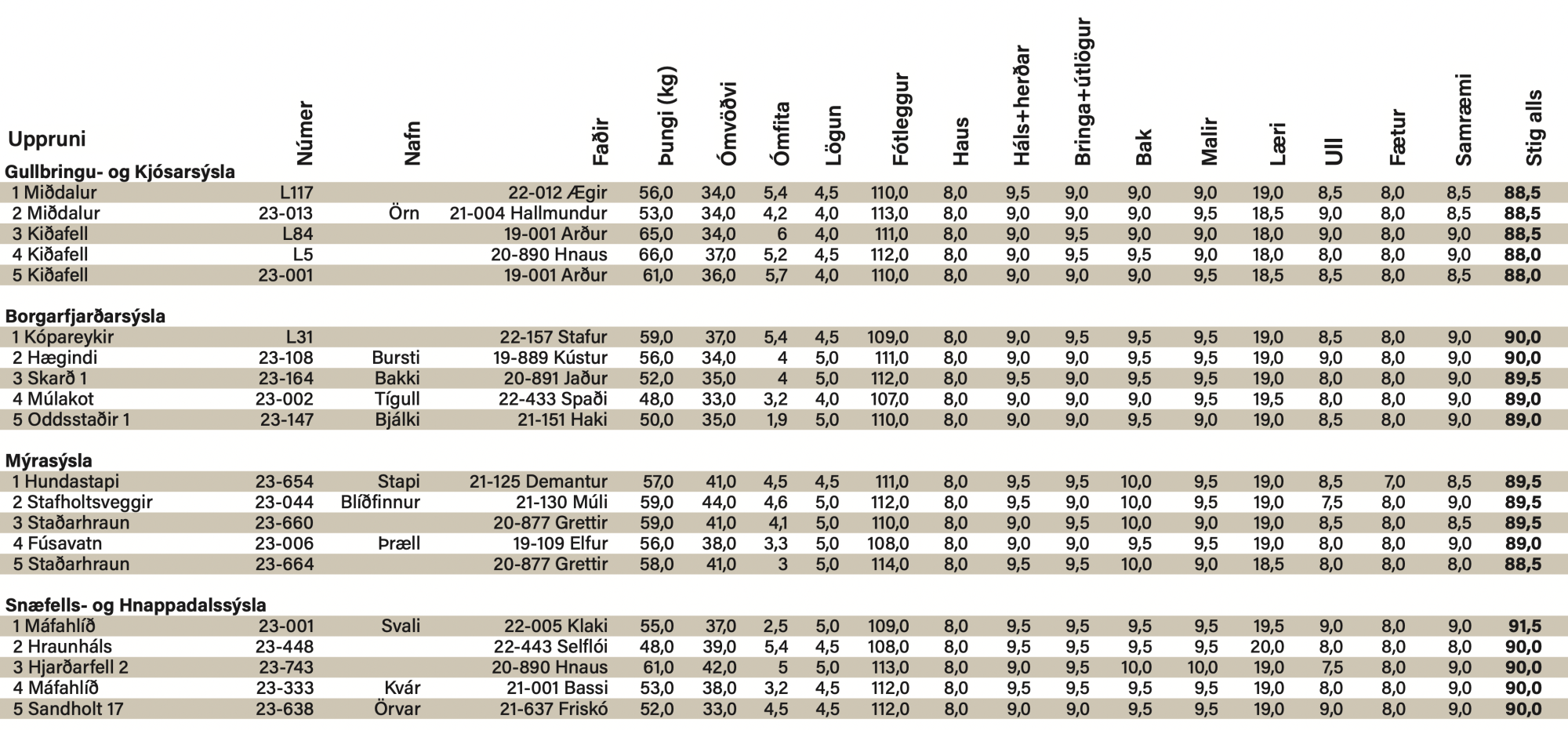 Skoðaðir voru rúmlega 11.800 lambhrútar. Þeir mældust að jafnaði með þykkari bakvöðva en áður hefur mælst, eða 31,6 mm. Í hópnum voru 70 hrútlömb sem mældust með bakvöðva á bilinu 40 til 44 mm. Þykkustu vöðvarnir í haust mældust í gimbrum en þær voru með 45 mm vöðva. Önnur frá Sölvabakka í Refasveit og hin frá Bæ 1 í Hrútafirði. Lömbin reyndust heldur feitari en áður og mældist bakfita í hrútum 3,4 mm að jafnaði. Að meðaltali hlutu hrútarnir 84,9 stig og vógu 48,1 kg. Til samanburðar þá var meðal lambhrúturinn með 85 stig haustið 2022, vó 47,7 kg og mældist með 31 mm þykkan vöðva.