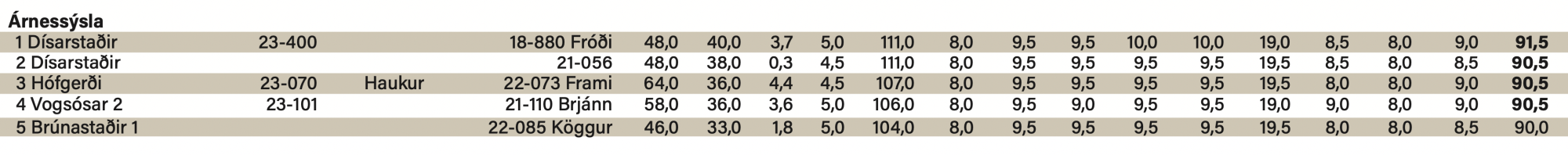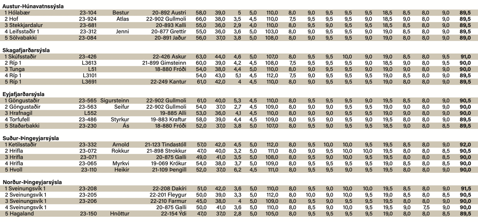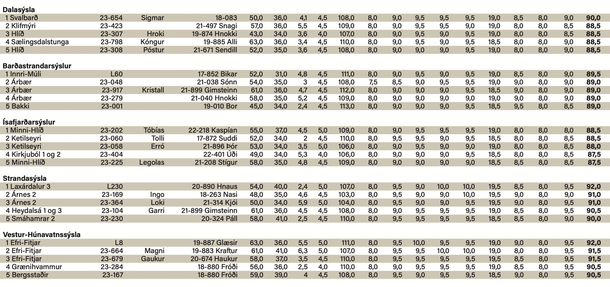 Þrír lambhrútar hlutu 92 stig í haust, en enginn hrútur fór svo hátt á síðasta ári. Sá hrútur sem raðast efst yfir landið er Arnold 23-332 frá Ketilsstöðum á Tjörnesi. Hann er svarflekkóttur að lit en trúlega hefur flekkóttur hrútur ekki áður staðið hrúta fremstur á landsvísu. Faðir hans, Tindastóll 21-123, er frá Syðri-Sandhólum og er sonur Glitnis 19-848 frá Efri-Fitjum og MMF er Lási 13-985 frá Leifsstöðum. Annar raðast hrútur nr. 230 frá Laxárdal í Hrútafirði. Hann er undan Hnaus 20-890 frá Mýrum 2 og er MFF hans Dreki 13-953 frá Hriflu. Þriðji í röðinni er síðan kollóttur hrútur frá Efri-Fitjum í Fitjárdal, lamb nr. 8. Sá er sonur Glæsis 19-887 frá Litlu-Ávík og MFF Dúlli 17-813 frá Miðdalsgröf.