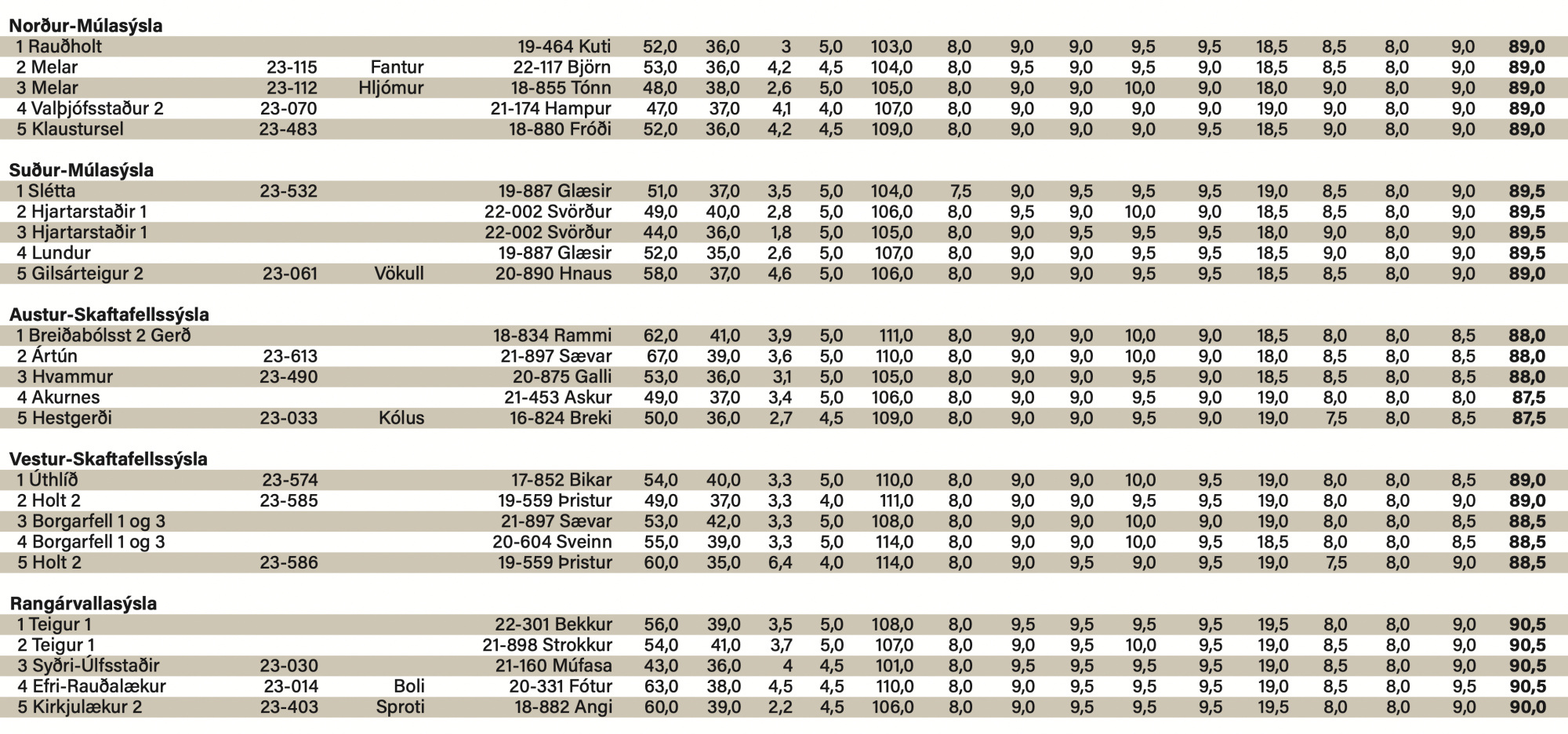 Í meðfylgjandi töflu er listi yfir hæststiguðu lambhrúta landsins, raðað eftir sýslum. Séu hrútar jafnir að heildarstigum er þeim raðað eftir samanlögðum stigum fyrir gerðarþætti (frampart, bak, malir og læri), þá eftir bakvöðvaþykkt, síðan fituþykkt og ef einhverjir standa enn jafnir ræður lögun vöðvans röð.