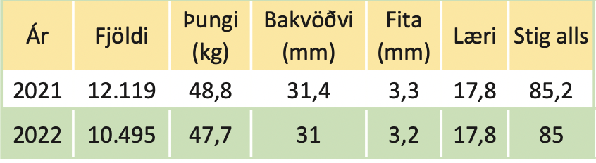 Í heildina var útkoma lamba í haust góð. Meðalfallþungi á landinu var 16,6 kg og hefur hann einungis þrisvar sinnum í sögunni farið hærra og miðað við síðastliðin 10 ár er þetta gott meðalár. Gerð sláturlamba var sú næstbesta frá því EUROP kerfið var tekið upp, eða 9,32, en hæst fór gerðareinkunnin á síðasta ári, þá 9,43. Fitueinkunn sláturlamba var 6,31 sem er heldur lægra en á síðustu árum og í raun æskilegt að stefna á að hækka þá tölu. Sláturlömbin hafa hins vegar ekki verið færri í meira en tvo áratugi.
