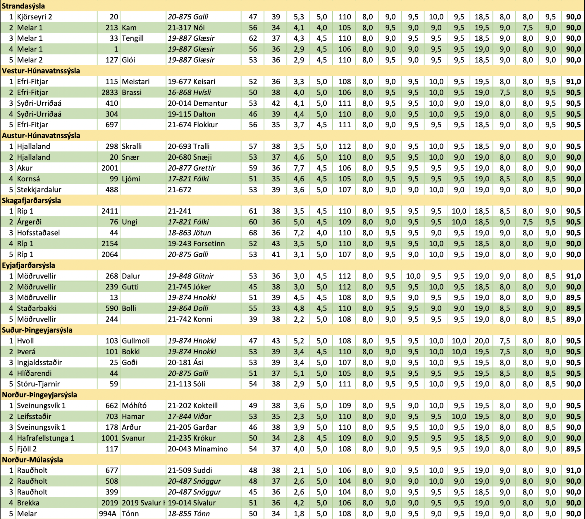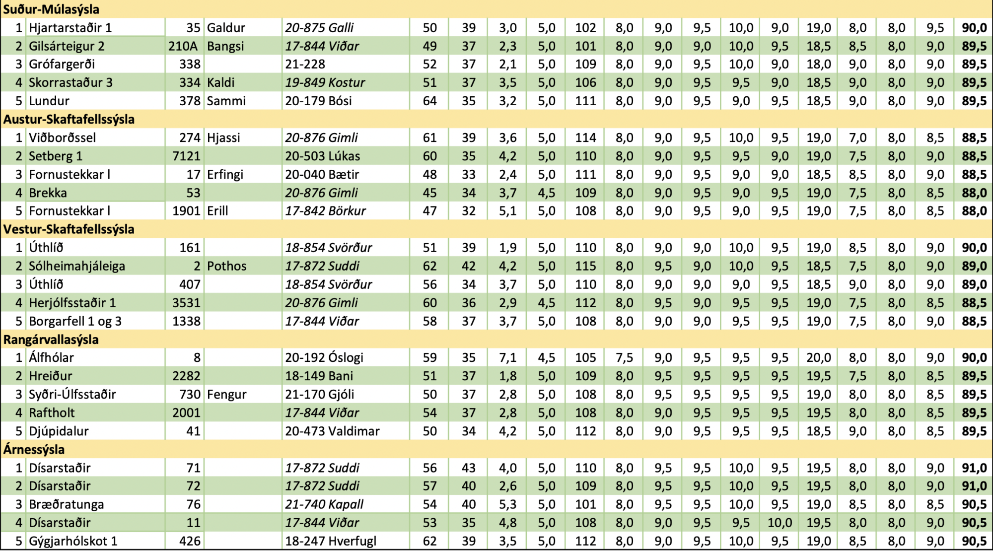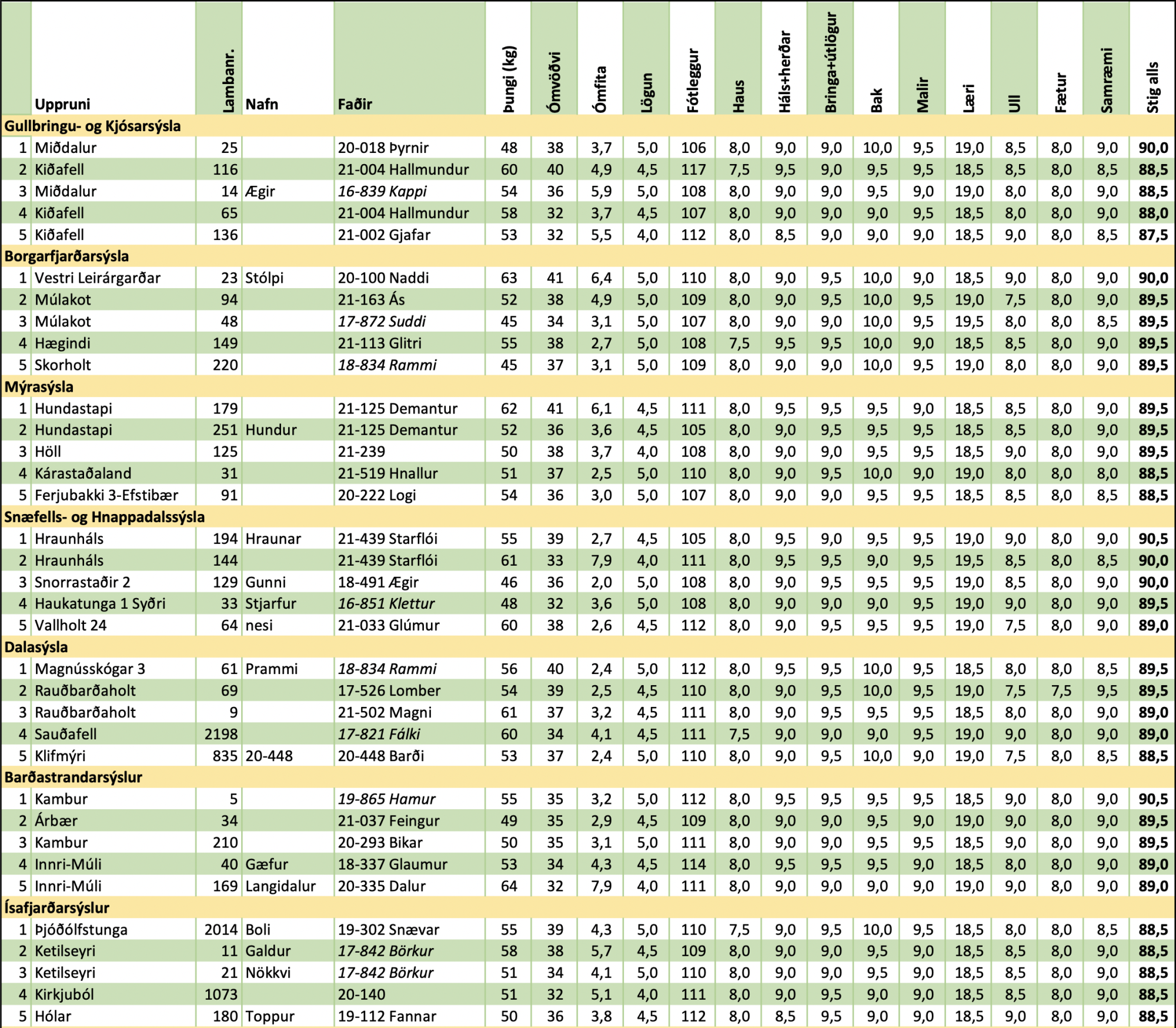 Í stóru töflunni er að finna yfirlit yfir 5 hæst stiguðu lambhrúta í hverri sýslu. Hrútunum er raðað á hefðbundinn hátt, þar sem fyrst er raðað eftir heildarstigum, síðan eftir samanlögðum stigum fyrir gerðarþætti, þá eftir bakvöðva, síðan fituþykkt og ef einhverjir standa enn jafnir er raðað eftir lögun vöðvans. Efstu hrútar landsins þetta haustið eru með 91 stig en það voru 5 hrútar sem náðu þeim árangri.
