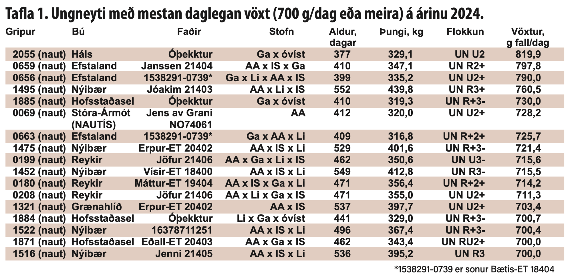 Niðurstöður skýrsluhaldsársins í nautakjötsframleiðslunni fyrir árið 2024 voru birtar fyrir skömmu. Þar var birtur listi yfir gripi sem náðu mestum daglegum vexti á árinu og miðað við a.m.k. 450 daga aldur við slátrun.