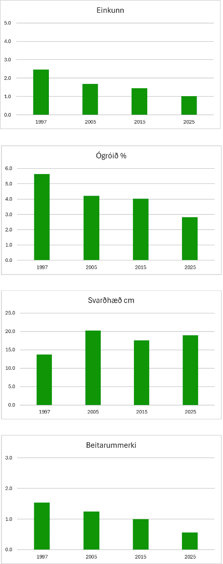 Þegar á heildina er litið hefur ástand lands farið jafnt og þétt batnandi frá fyrstu úttekt árin 1997 – 1998 (sjá línurit). Mest er breytingin á milli fyrstu og annarrar úttektar en einnig kemur hún fram í úttektinni 2025 þegar litið er til ástandseinkunnar, ógróins yfirborð og beitarummerkja (línurit). Batnandi ástand birtist í að gróska lands (svarðhæð) hefur aukist, ógróið yfirborð minnkað og dregið mjög úr beitarummerkjum á gróðri. Þetta má án vafa rekja til þess að yfir það heila hefur dregið úr beitarálagi af völdum hrossa og sauðfjár á svæðunum en jafnframt hefur loftslag hlýnað á undanförnum 30 árum. Á nær öllum þessum svæðum sem farið var um á Norðurlandi 2025 sáust skýr merki um að ástand lands væri gott eða hefði farið batnandi frá fyrstu úttekt. Dæmi um það var land á Víðidalstunguheiði, í Sauðadal, Kolbeinsdal, Garðsárdal og ofan fjallsgirðinga í Eyjafirði. Á þessu voru þó undantekningar. Á norðanverðri Arnarnvatnsheiði hafði ástand lítið breyst en þar er hrossum enn beitt á rýrt land og er álag meira en góðu hófu gegnir. Uppi á Landi á Silfrastaðaafrétt var margt hrossa og merki um að ástand lands hefði versnað frá úttektinni 2015. Niður í dalnum í Hálfdánartungum við Norðurá var ástand lands hins vegar mun betra.
