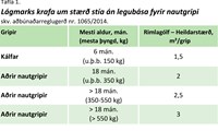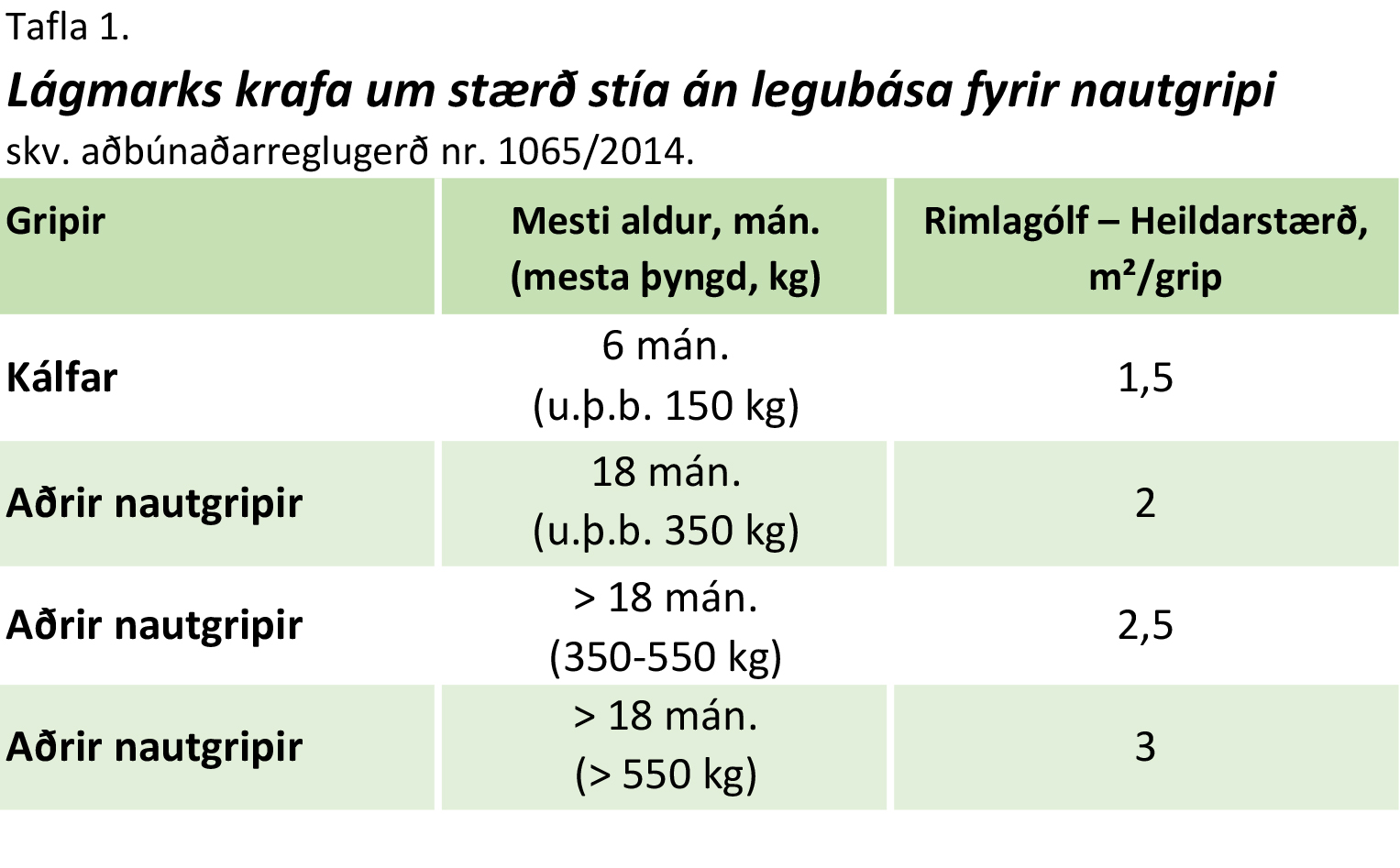 Með tilkomu nýrrar aðbúnaðar­reglugerðar fyrir nautgripi, nr. 1065/2014, má velta fyrir sér hvort einhverjir hlutar ákvæða hennar séu ekki uppfylltir við uppeldi gripanna á búinu. Hægt er að fjalla um marga þætti en vaxtarrými er ein þeirra forsenda sem hefur áhrif á vaxtarhraða gripa. Fyrir þá sem ala gripi í stíum kemur m.a. fram að „stíur fyrir gripi í uppeldi skulu þannig gerðar eða það margar að hægt sé að skilja misstóra gripi að“. Annars staðar stendur líka að „óheimilt er að halda gripi í uppeldi saman í stíu þar sem aldursmunur og/eða þyngdarmunur er verulegur þannig að það valdi einelti, vanfóðrun eða vanþrifum“. Þá kemur fram tafla í viðauka reglugerðarinnar þar sem tilgreint er áætlað lágmarks vaxtarrými gripa miðað við aldur og þunga – afrit af þessari töflu má sjá hér að neðan.