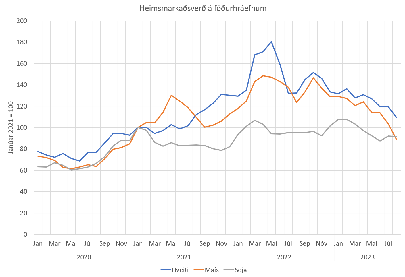 Verð á innfluttum hrávörum í fóður fylgir að mestu sömu þróun og hefur verið á heimsmarkaðsverði.