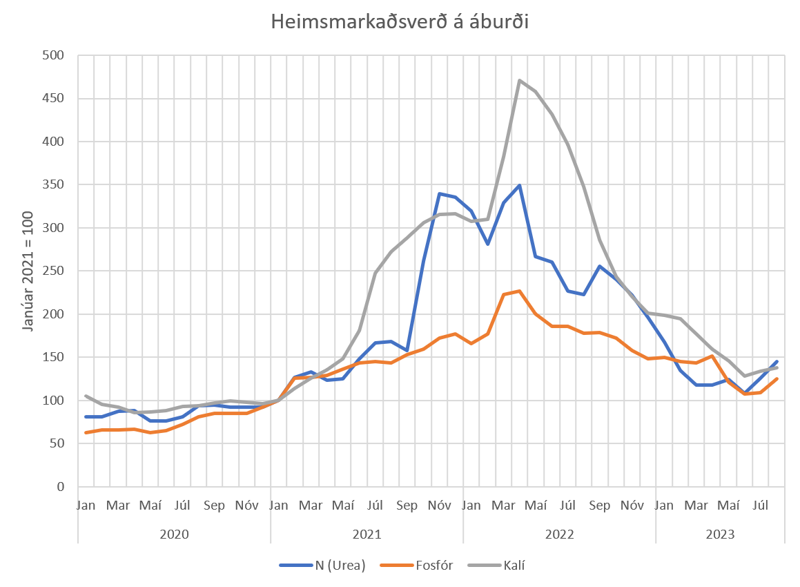 Síðustu mánuði hefur verð á áburði farið lækkandi. Einkum á áburði sem framleiddur er úr jarðgasi, svo sem UREA, en áburður sem fæst við námuvinnslu, svo sem DAP og MOP, hefur lækkað minna. Þrátt fyrir lækkun á áburði eru bændur enn að draga úr notkun áburðar.