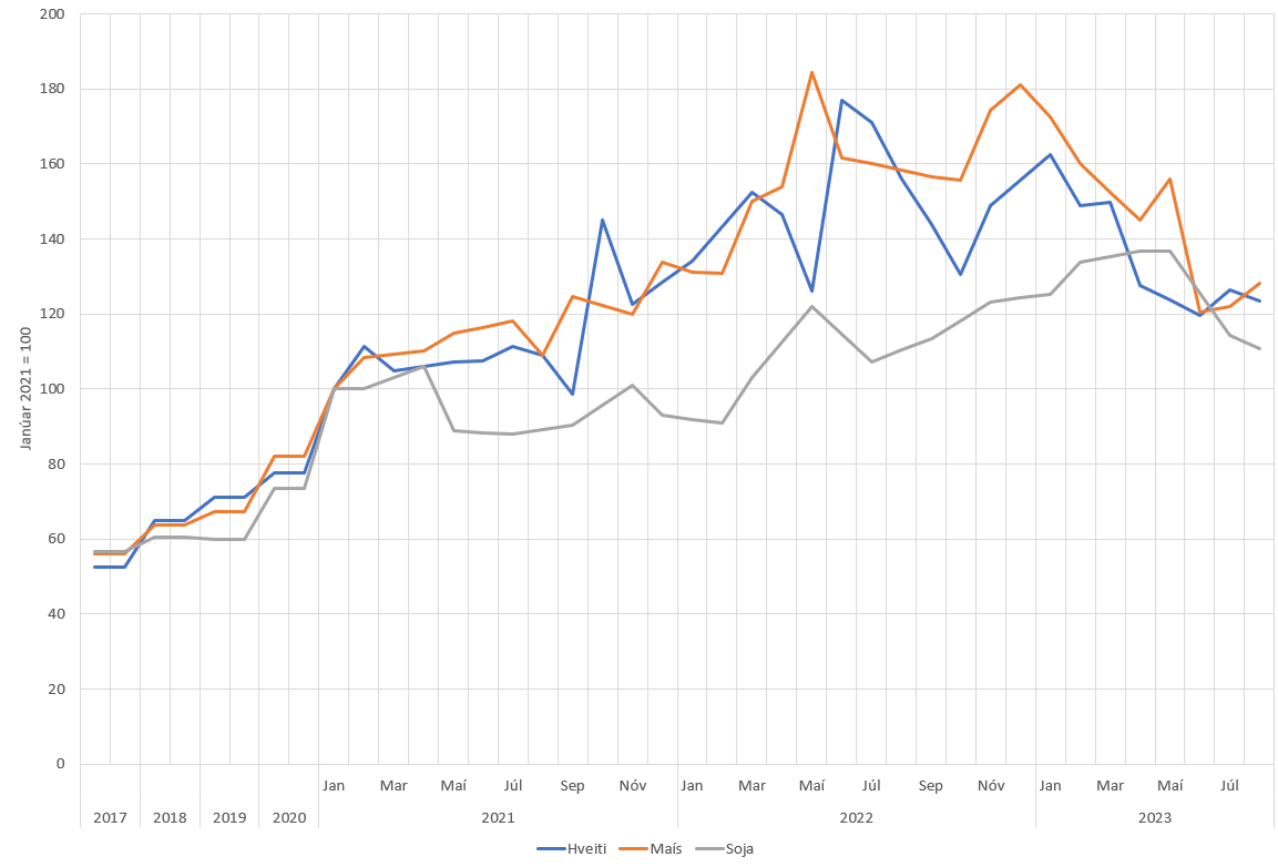 Á fyrsta ársfjórðungi var hveitiverð 100 prósent yfir meðaltali áranna 2015-19 og verð á maís var 80 prósent hærra. Lækkun kornvöruverðs árið 2023 er knúin áfram af opnun viðskipta með korn frá Úkraínu um Svartahaf (sem nú er lokað fyrir) og góð uppskera í öðrum helstu framleiðslulöndum.