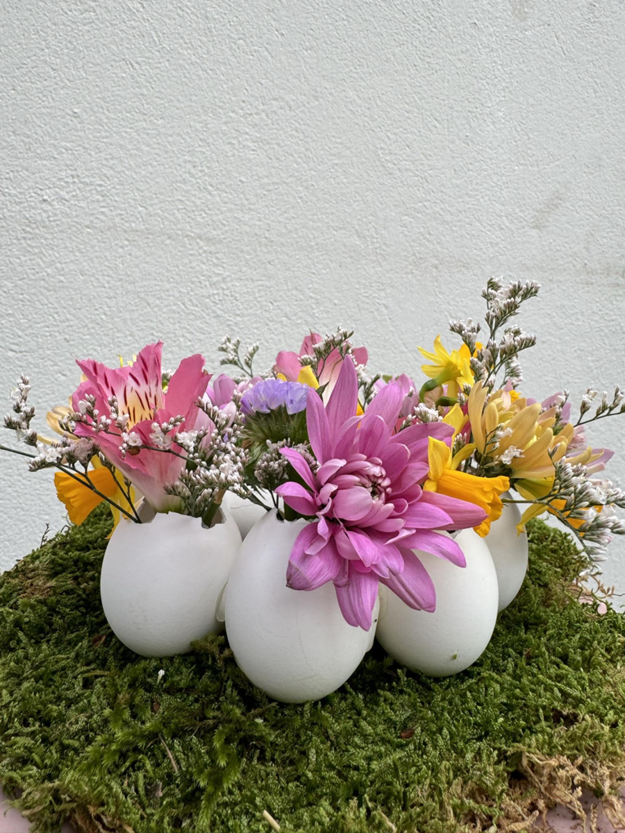 Mosi úr grasflötinni getur sett náttúrulegt yfirbragð á páskaskreytingarnar enda minnir mjúkur mosinn okkur á hreiðurgerð fugla og hægt að gera skemmtilegt undirlag undir páskaegg, einkum og sér í lagi af súkkulaðitaginu. Einnig getur komið vel út að sjóða egg og nota skurnina í skreytingarnar, egg eru jú nátengd páskunum, rétt eins og guli liturinn.