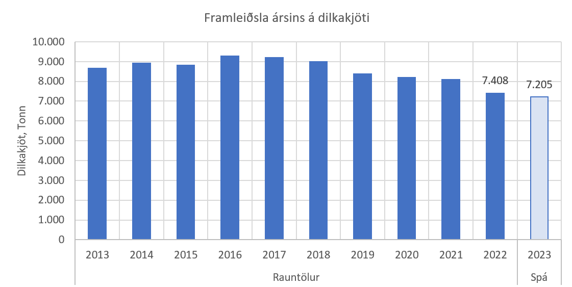 Þrátt fyrir aðgerðir á síðasta ári er því miður ekki hægt að segja að betur líti út með rekstur sauðfjárbúa árið 2023. Viðbótarstuðningur stjórnvalda á síðasta ári var einskiptis aðgerð. Á síðasta ári hækkaði afurðaverð til bænda um 35%. Sú hækkun gerði lítið annað en að leiðrétta, fordæmalaust hrun afurðaverðs á árunum 2016-2017. Verðhækkanir á helstu rekstrarvörum hafa aðeins gengið til baka að litlu leyti. Í sumum tilvikum hækkað enn frekar. Það er því áfram vert að hafa áhyggjur af afkomu þeirra sem stunda sauðfjárbúskap. Frá haustinu 2016 hefur framleiðsla á dilkakjöti dregist saman um 20%. Farið úr 9.283 tonn niður í 7.408 tonn. Verði ekki brugðist við mun enn aukast á samdrátt í greininni.