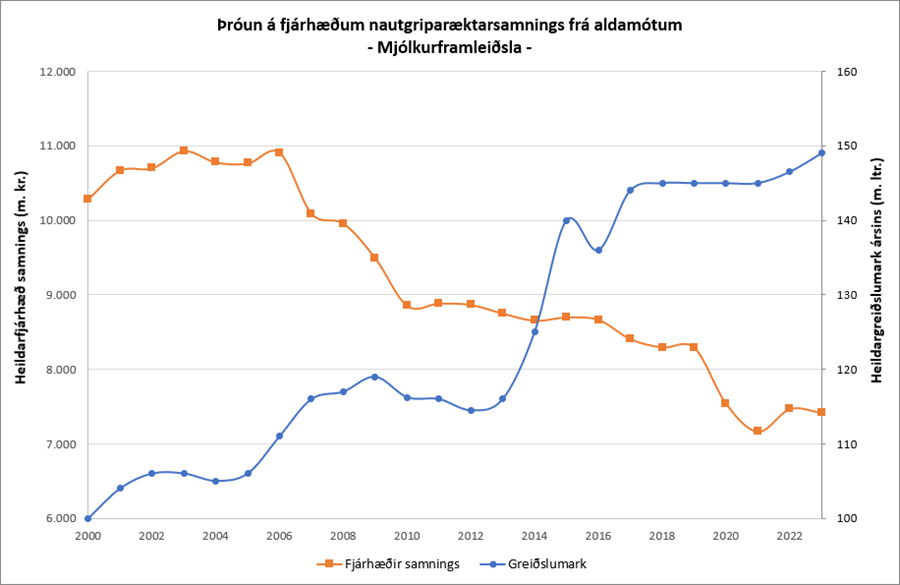 Frá aldamótum hafa íslenskir mjólkurframleiðendur brugðist við aukinni eftirspurn mjólkur með auknum framförum í afköstum og framleitt mjólk upp í heildargreiðslumark sem er í dag 149 milljónir lítra en var 100 milljónir lítra árið 2000. Á sama tíma hefur heildarríkisstuðningur við nautgriparæktina lækkað um þrjá milljarða. Stuðningsgreiðslur á hvern lítra hafa þannig lækkað úr 103 kr./ltr. niður í 49,8 kr./ltr. sé gert ráð fyrir því að heildarstuðningur nautgriparæktarinnar deilist allur á greiðslumark hvers árs. Á sama tíma hefur nautakjötsframleiðsla einnig aukist til muna. Í lok árs 2004 voru 3.592 tonn framleidd af nautgripakjöti en í lok árs 2022 var magnið 4.948 tonn. Samhliða aukinni eftirspurn hafa bæst við auknar kröfur um gæði framleiðslunnar, bættan aðbúnað og loftslagsaðgerðir. Ljóst er því að raunverulegur stuðningur á hvern lítra mjólkur og hvert kíló nautakjöts er enn lægri en tölurnar hér til hliðar gefa til kynna. Nautgripabændur hafa náð umtalsverðri hagræðingu síðustu ár, búum hefur fækkað en afköst á hvert bú og hvern grip stóraukist, samhliða hefur greinin dregið verulega úr losun kolefnis og aðbúnaður nautgripa, heilt yfir, aldrei verið betri. En aukinn fjármagnskostnaður tekur verulega í, sérstaklega á þeim búum sem þar mest uppbygging hefur orðið og við nálgumst óðar rekstrarleg sársaukamörk búanna.