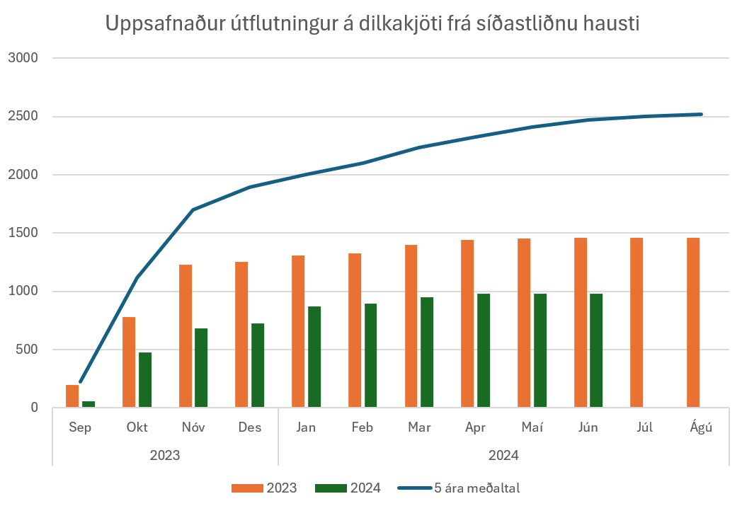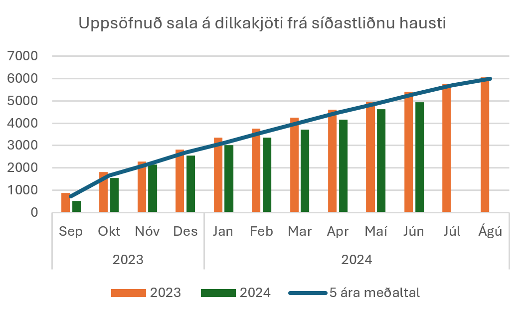 Heildarsala á dilkakjöti frá haustinu 2023 var í júní 4.931 tonn. Sem er um 8,6% samdráttur borið saman við sama tímabil árið áður.