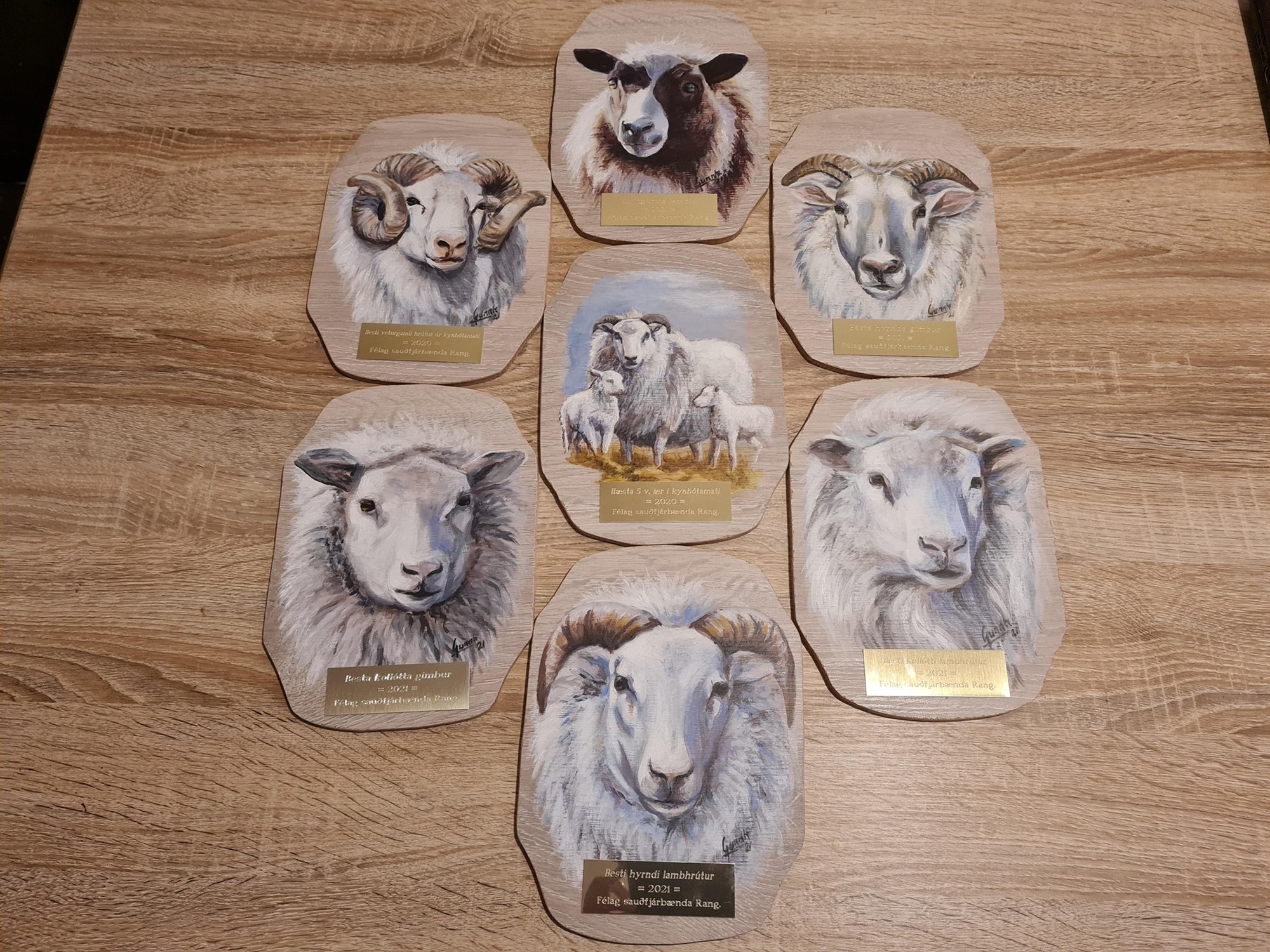 Gunnhildur Jónsdóttir, myndlistarkona frá Berjanesi, hefur nú í nokkuð ár málað myndir af kindum á tréplatta og fá sigurvegarar plattann til eignar.