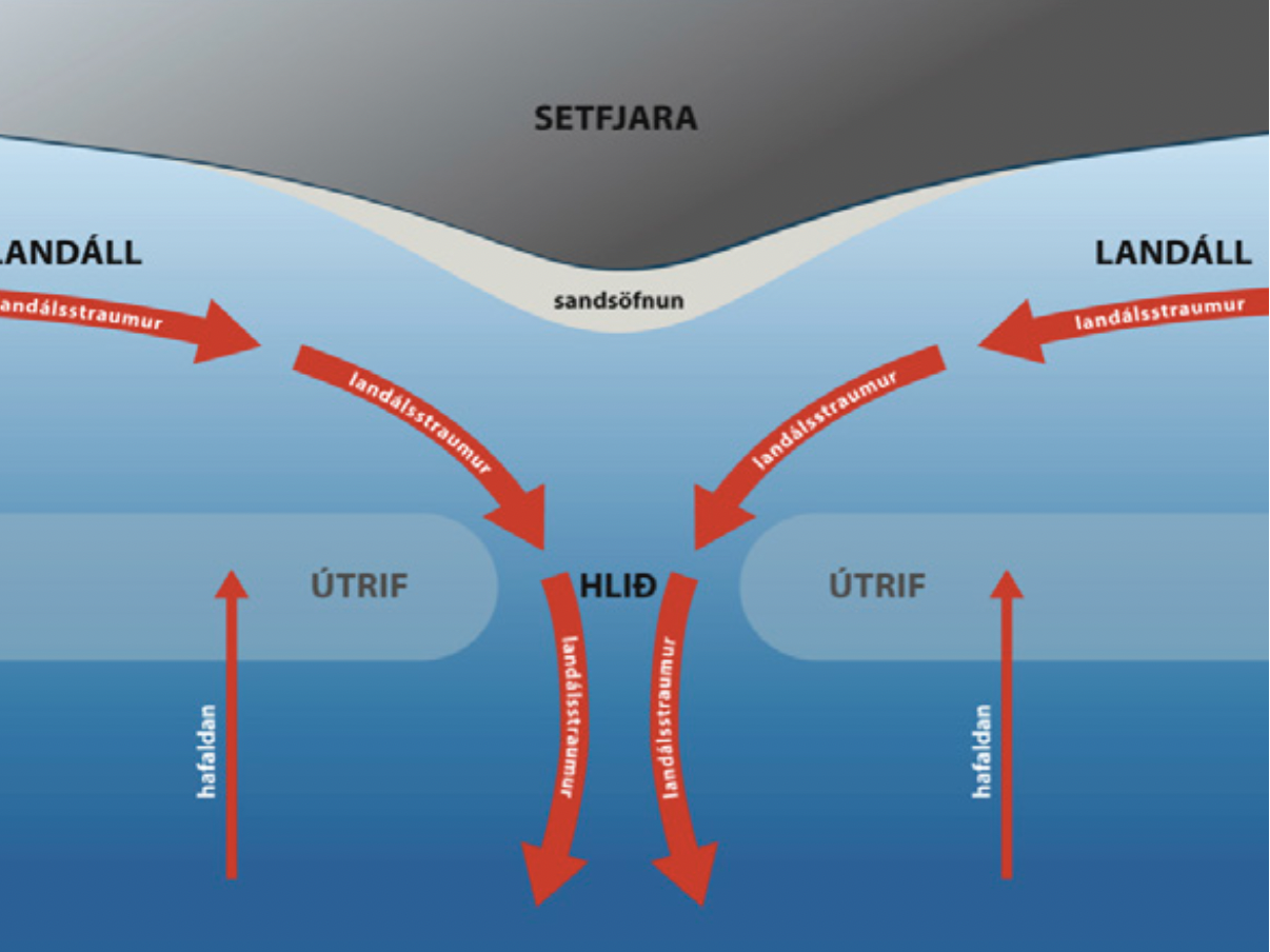 Þau hugtök strandjarðfræðinnar sem mestu máli skipta fyrir niðurstöðuna, auk þeirra sem rædd voru í fyrri greininni, eru útrif, landáll, áhlaðandi og strandstraumar, hlið og hliðstraumar. Ég ætla að byrja á því að skýra þessi hugtök hvert fyrir sig og útlista hvað þau gera.