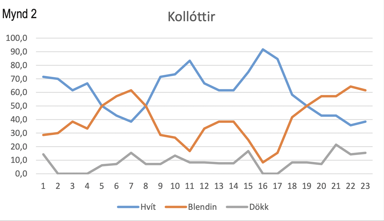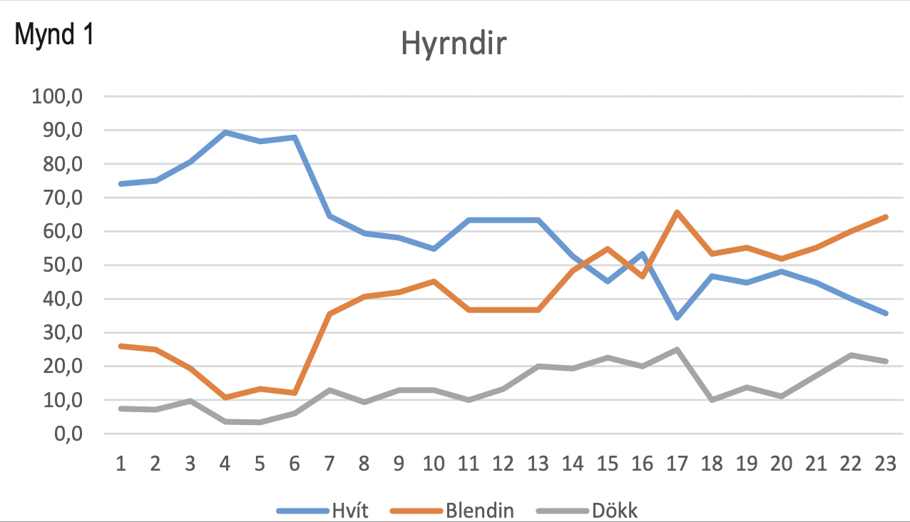 Ég flokkaði hrútana einfaldlega í arfhreina hvíta hrúta (lína merkt hvít á myndunum) og hins vegar alla aðra hrúta, arfblendna hvíta og af öðrum lit en hvítum (lína merkt blendin á myndunum). Einnig voru taldir sérstaklega hrútar sem ekki voru hvítir (lína merkt dökk á myndunum). Tölurnar eru sýndar sem hlutfallstölur allra hrúta sem flokkaðir voru úr hrútaskrá hvers árs.