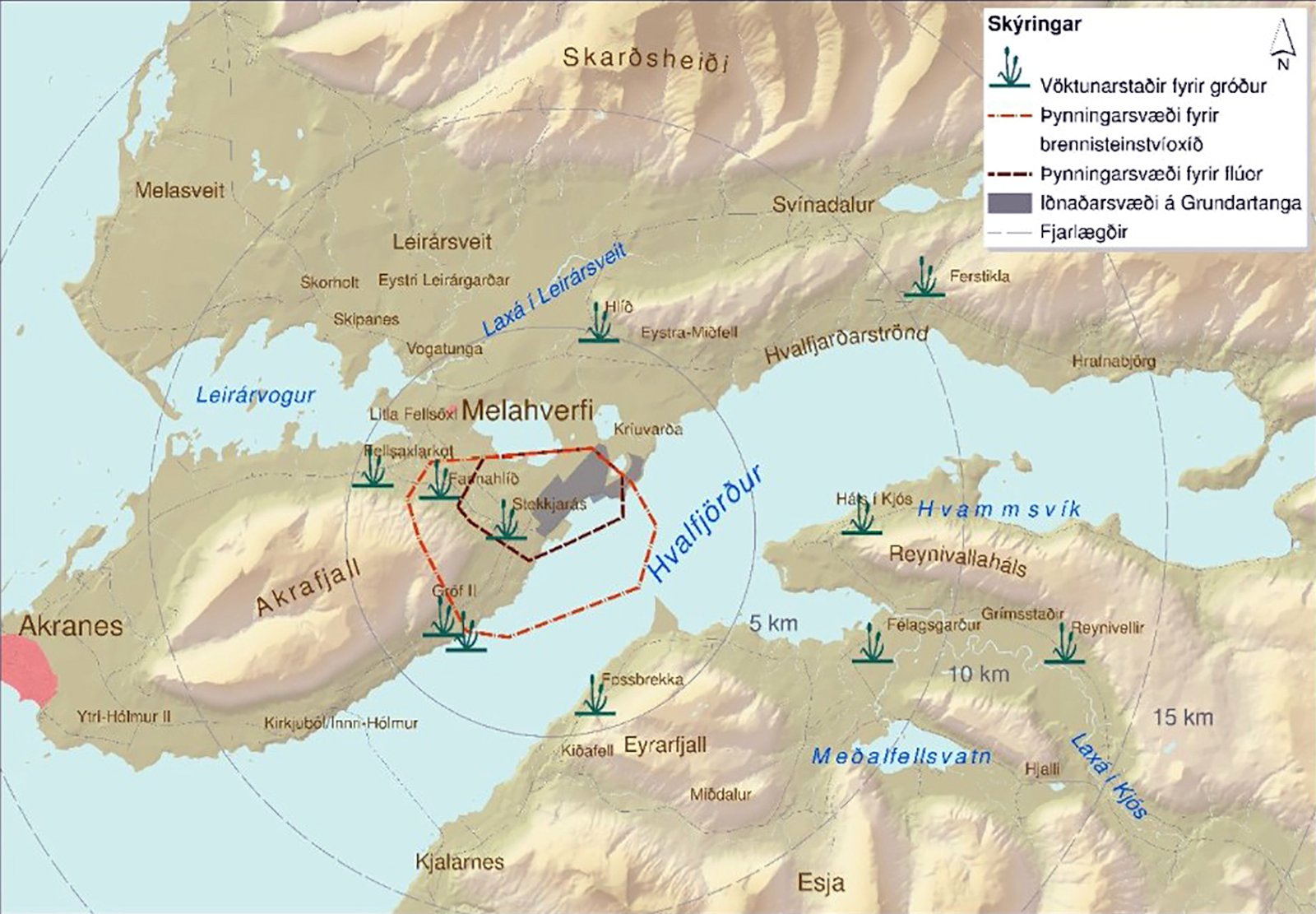 Sýnatökustaðir gróðurs. Búið er að færa inn staðsetningu Kúludalsár inn á kortið. Úr skýrslu EFLU, Umhverfisvöktun iðnaðarsvæðisins á Grundartanga fyrir 2015.