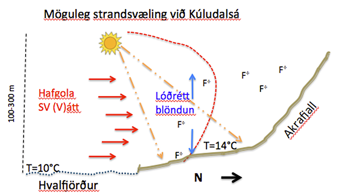 Hafgolan í Hvalfirði að sumri er hins vegar heldur flóknari viðfangs en á Reyðarfirði. Beygja er á firðinum og svæði undirlendi víðar en bara inni í botni. Að næturlagi og fram á sólríka morgna leggur í kyrrlátu veðri hæga ANA-átt út fjörðinn. Loft sem inniheldur flúor frá álveri Norðuráls berst þannig yfir bæina, bæði Gröf II og Kúludalsá. Uppstreymi vegna upphitunar neðan frá kemur í veg fyrir að flúorgas eða -ryk berist til jarðar. Seint um morguninn fer hins vegar að bera á hafgolunni sem er vestanstæður vindur. Við loftblöndun, m.a. vegna svokallaðs samstreymis, sogast loftið úr efri lögum og nær niður til yfirborðs við ströndina. Aðstæðurnar geta verið staðbundnar og standa e.t.v. aðeins rétt á meðan hafgolan er að ná yfir. Sunnudagurinn 31. júlí sl. var einn þessara daga og telst nokkuð dæmigerður. Mátti þá sjá á veðurspám sem reiknaðar eru í fínu neti hvernig hafgoluskilin skella á ströndinni undir Akrafjalli um kl. 11 eftir að andvari hafði staðið út fjörðinn og yfir Grundartanga allt frá því snemma morguns. Þetta er sýnt á meðfylgjandi skýringarmyndum.