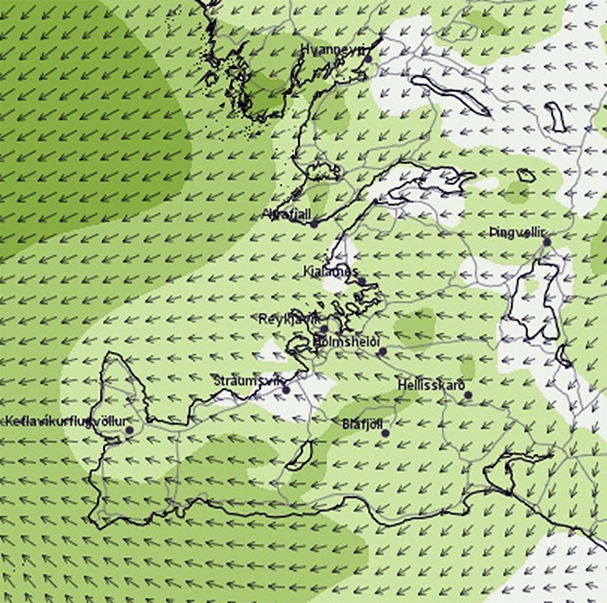 Vindafar 31. júlí 2016 kl. 06. ANA-átt út Hvalfjörðinn 2–4 m/s. Greiningarkort fengið af Brunni Veðurstofunnar. Líkan: Harmonie með 2,5 x 2,5 km möskva.
