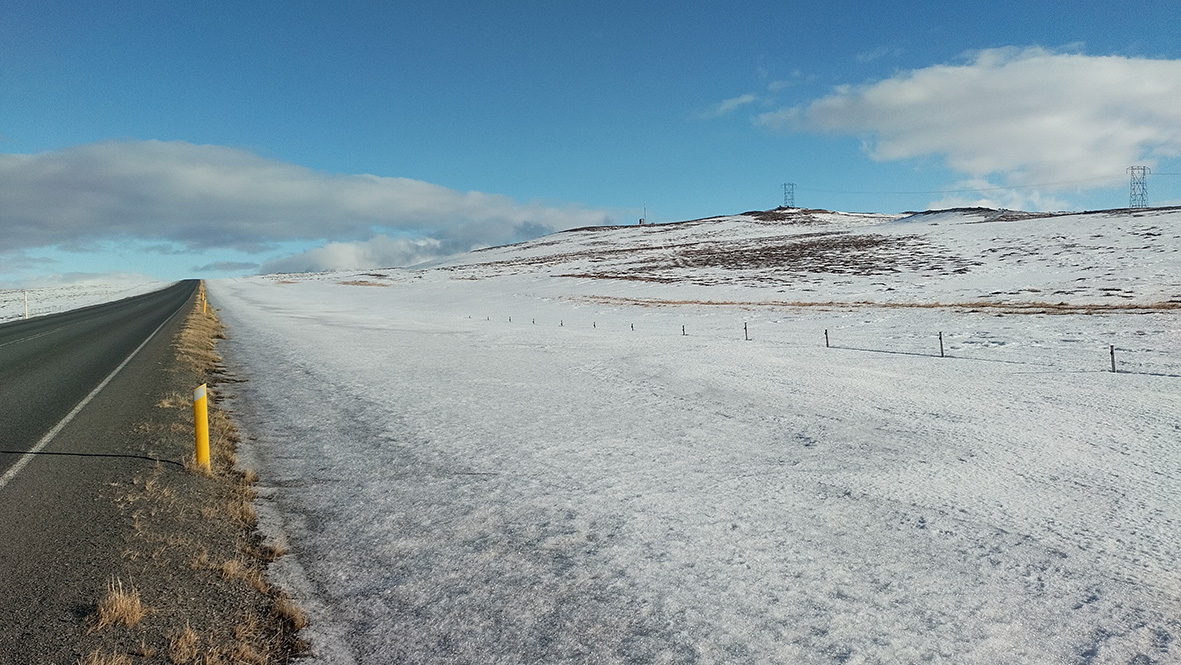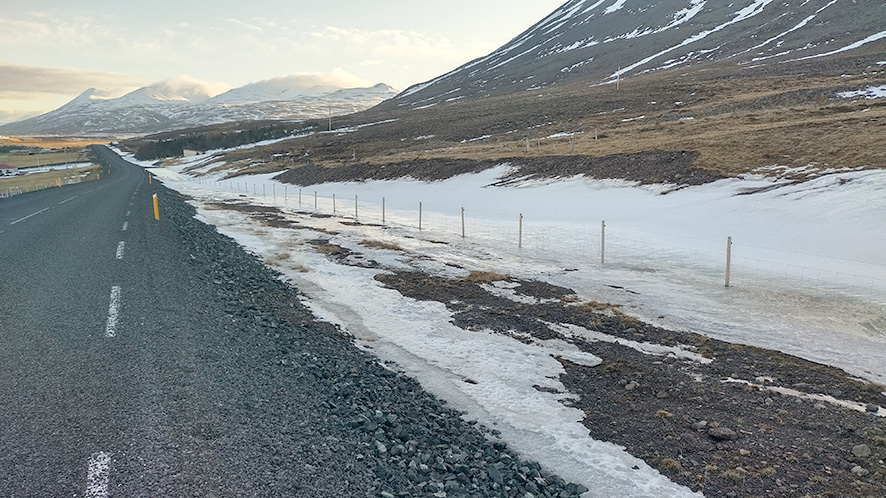 Nýlagður vegur og girðingin sett rétt við veginn þar sem er klaki og snjór þrátt fyrir hláku í marga daga. Örfáum metrum til hægri er bakki sem oftast er snjólítill eða snjólaus. Til hvers í fjáranum er verið að leggja girðinguna í lægðina?