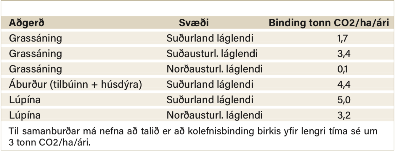 Í úttekt Landgræðslunnar á kolefnisbindingu í jarðvegi á mælitímabilinu 2007–2011 kemur hins vegar fram að binding lúpínu í jarðvegi á umræddu tímabili virðist aðeinsum0,3tonnáhaáárien binding við grassáningu virðist um 4,4 tonn. Ætla má að sá mikli mismunur sem fram kemur annars vegar við heildarbindingu og hins vegar við bindingu í jarðvegi bendi til að sú mikla binding lúpínu sem fram kemur í fyrri athugunum sé vegna mikils vaxtar ofanjarðar en gras bindi fremur í rótum undir yfirborði jarðar. Hér verður þó að hafa í huga að ætla má að grassáningunni fylgi veruleg áburðargjöf í nokkur ár og slík ræktun því vart raunhæf við nýtt áburðarverð.