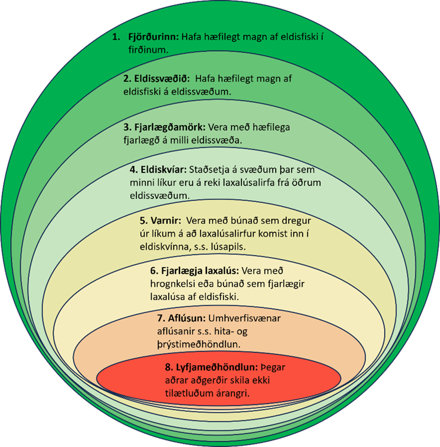 Á mynd 1 er gefið yfirlit yfir mögulegar varnir og mótvægisaðgerðir til að halda laxalús í skefjum áður en kemur til notkunar laxalúsalyfja. Hér skiptir máli magn af eldisfiski í firðinum en framleiðsla laxalúsalirfa er meiri með auknum fjölda fiska. Jafnframt er fjarlægð á milli eldissvæða mikilvæg en meira smit berst almennt af laxalúsalirfum eftir því sem vegalengdir eru styttri. Í of mörgum tilvikum hefur ekki verið sýnd nægileg fyrirhyggja í skipulagi eldisins í kapphlaupi um að ná sem mest af leyfum og fjárhagslegum ávinningi. Það eru síðan ýmsar leiðir til að koma í veg fyrir að laxalúsalirfur berist inn í sjókvína og einnig til að ná lúsinni af fiski í kvínni en hér er oft um kostnaðarsamar aðgerðir að ræða sem rekstraraðilar hafa almennt farið í með takmörkuðum hætti.