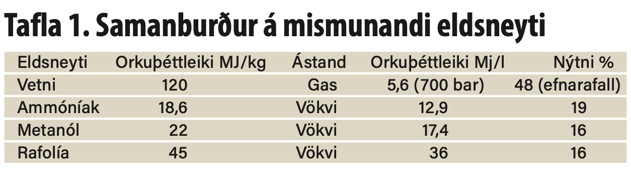Í töflu 1 er yfirlit yfir helstu tegundir fyrirhugaðs rafeldsneytis. Vetni er grunnur fyrir allar aðrar tegundir og er hægt að nota það beint á brunahreyfil eða efnarafal. Þar sem það er í gasformi og er með minna orkuinnihald á líter en fljótandi eldsneyti hentar það síður þar sem rúmmál skiptir máli. Aðrar tegundir eins og ammóníak og metanól hafa hærra orkuinnihald per líter en um helmingi minni en rafolía og eru fljótandi við flestar aðstæður. Framleiðsla vetnis er mjög orkufrek og við frekari vinnslu í aðrar tegundir lækkar heildarnýtni hratt eins og fram kemur í töflunni.