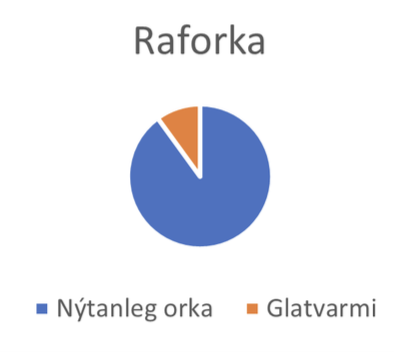 Ísland framleiðir 20 TWh sem er 1/1.500 af heildarraforkunni og eru í 1. sæti í raforkuframleiðslu á mann með 99% endurnýjanlega orku. Raforka er skilgreind sem unnin orka sem er mun verðmætari en frumorka. Við það að breyta frumorku í unna orku fást aðeins um 40% orkunnar.