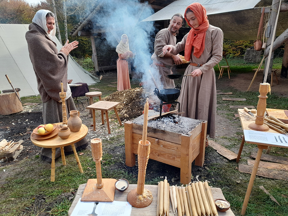 Þarna mátti líta við í fatagerð þar sem ull var unnin og þráður spunninn. Og þarna var vefstóll sem minnti nokkuð á kljásteinavefstólinn sem við þekkjum á Þjóðminjasafninu okkar. Matargerð miðast öll við daglegt fæði á miðöldum.