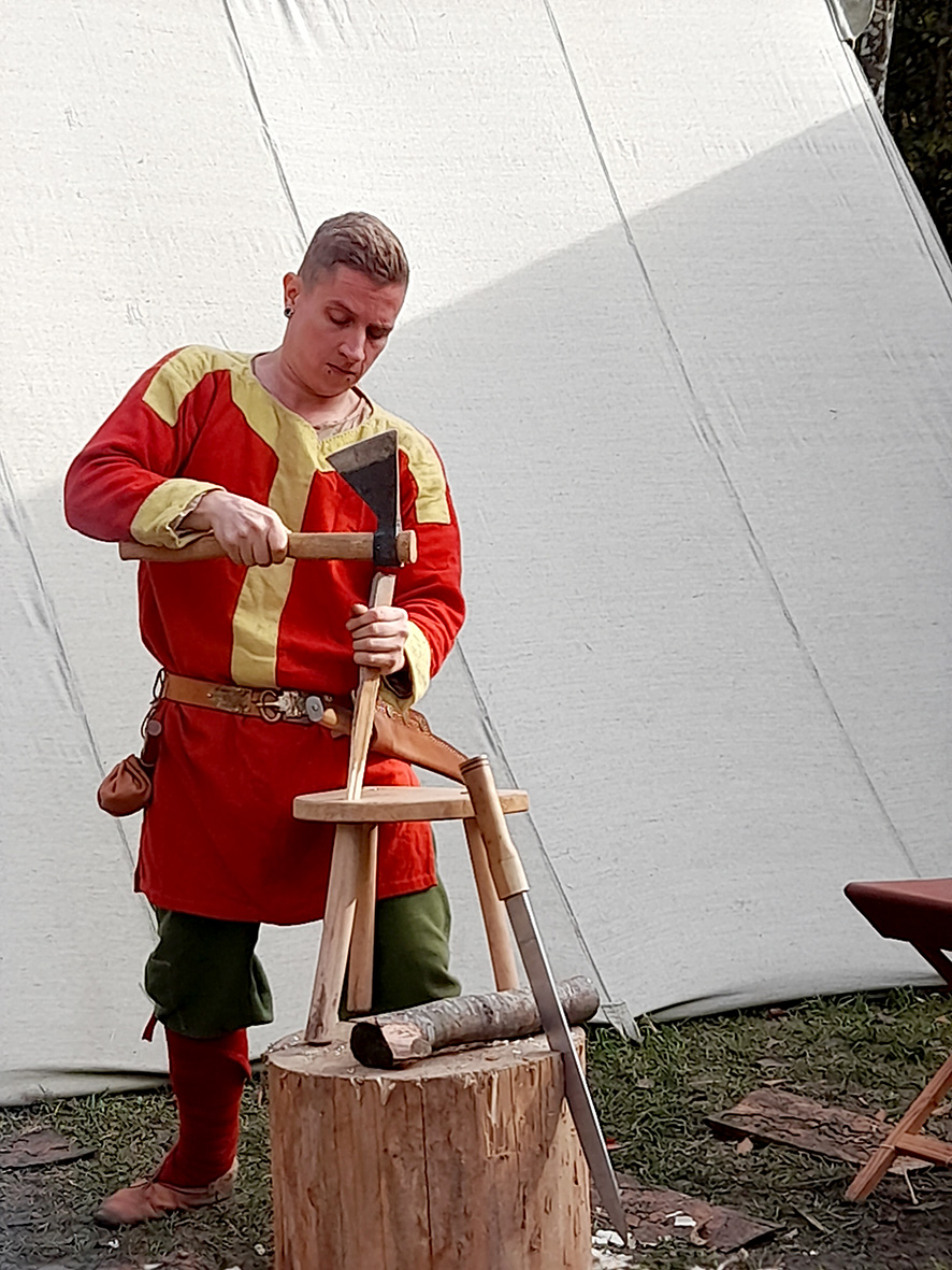 Þetta starf er unnið í sjálfboðavinnu þar sem eldri iðnaðarmenn kenna þeim yngri sérsvið sitt. Þá er þeim sem eru á herskyldualdri gefinn kostur á að taka þátt í þessu starfi undir leiðsögn þeirra eldri og kemur þá þetta starf í stað herskyldu. Allir, bæði þeir sem eldri eru og þeir sem yngri eru, konur og karlar, klæðast klæðnaði eins og tíðkaðist á miðöldum og hafa handverkfæri eins og þá voru notuð. Nútíma rafmagnsvélar og önnur verkfæri sem þykja sjálfsögð í dag eru hvergi sjáanleg, enda er til þess ætlast að þessi mannvirki séu eins ekta í stíl við miðaldir og unnt er. Þarna má ganga á milli handverksfólksins og sjá gömul vinnubrögð unnin af handverksfólki sem hefur sett sig vel inn í þessa horfnu tíma. Þarna mátti sjá handverk af öllu mögulegu tagi þar sem framleidd voru byggingarefni af ýmsu tagi. Trésmiðir móta timburborð til húsagerðar, stórir trjábolir eru ýmist klofnir eða sagaðir og mótaðir eftir því sem þörf er á, hvort sem er í burðarstoðir, klæðningu utan húss sem innan eða í þök. Þakskífur úr timbri eru útbúnar sérstaklega og er það hlutverk kvenna að kljúfa og stílsniða úr vel völdum tilsniðnum timburbolum. Endingartími þak­ skífnanna er allt að heilli öld en þá er þakið rifið en þakskífurnar má nota allt að fjórum sinnum við endurgerð þaksins. Áhugavert er hversu mikil natni er sýnd öllum þessum verkum og snyrtimennska höfð í hávegum.