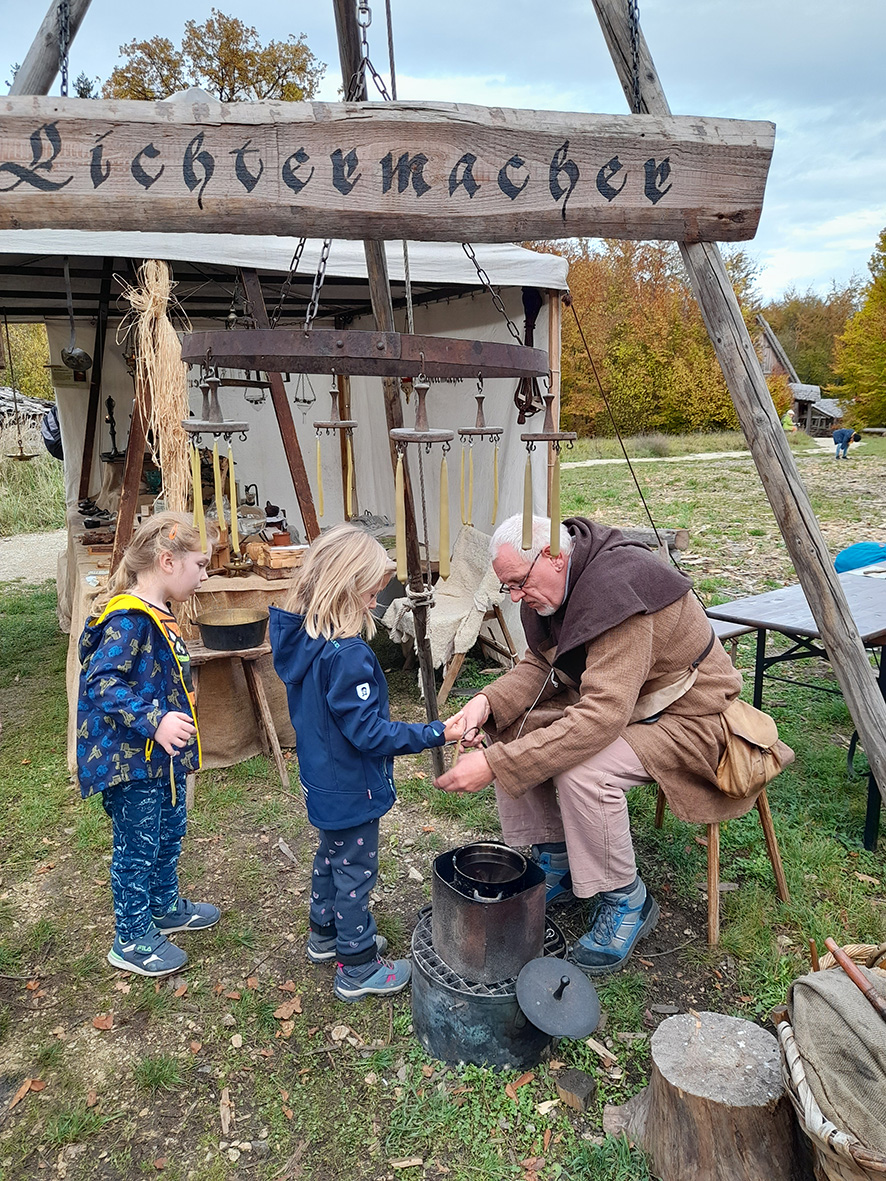 Við litum inn í járnsmiðju þar sem hörkuduglegir handverksmenn voru við smíðar áhalda og sitthvað annars sem þarfnast til bygginga. Og litið var inn til bakarans og matargerðarfólks en í þessu þorpi er veitingastaður þar sem unnt var að fá rétti eins og þeir voru tilreiddir á miðöldum.