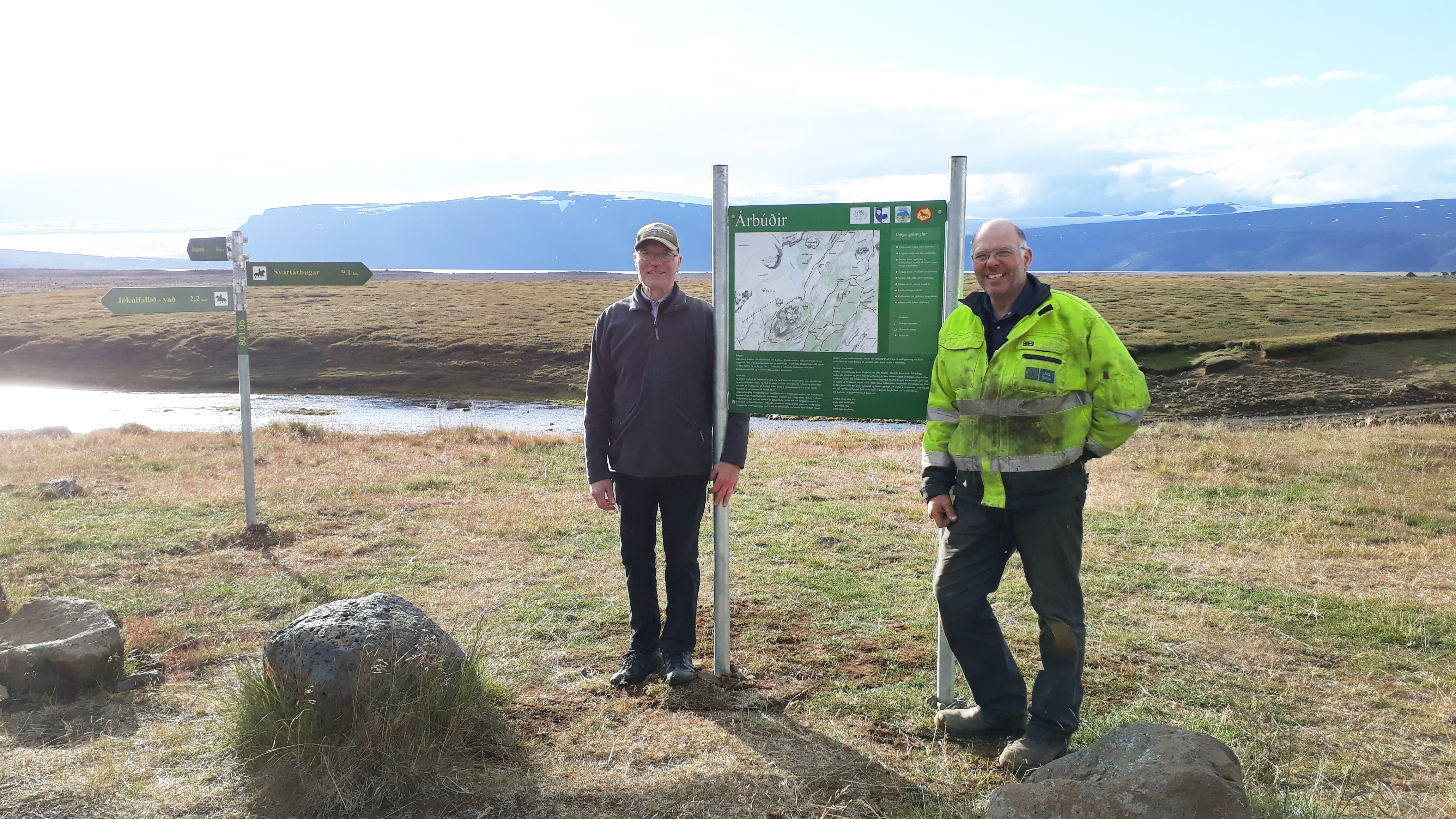 Bræðurnir Egill og Ólafur Jónassynir við skilti í Árbúðum.