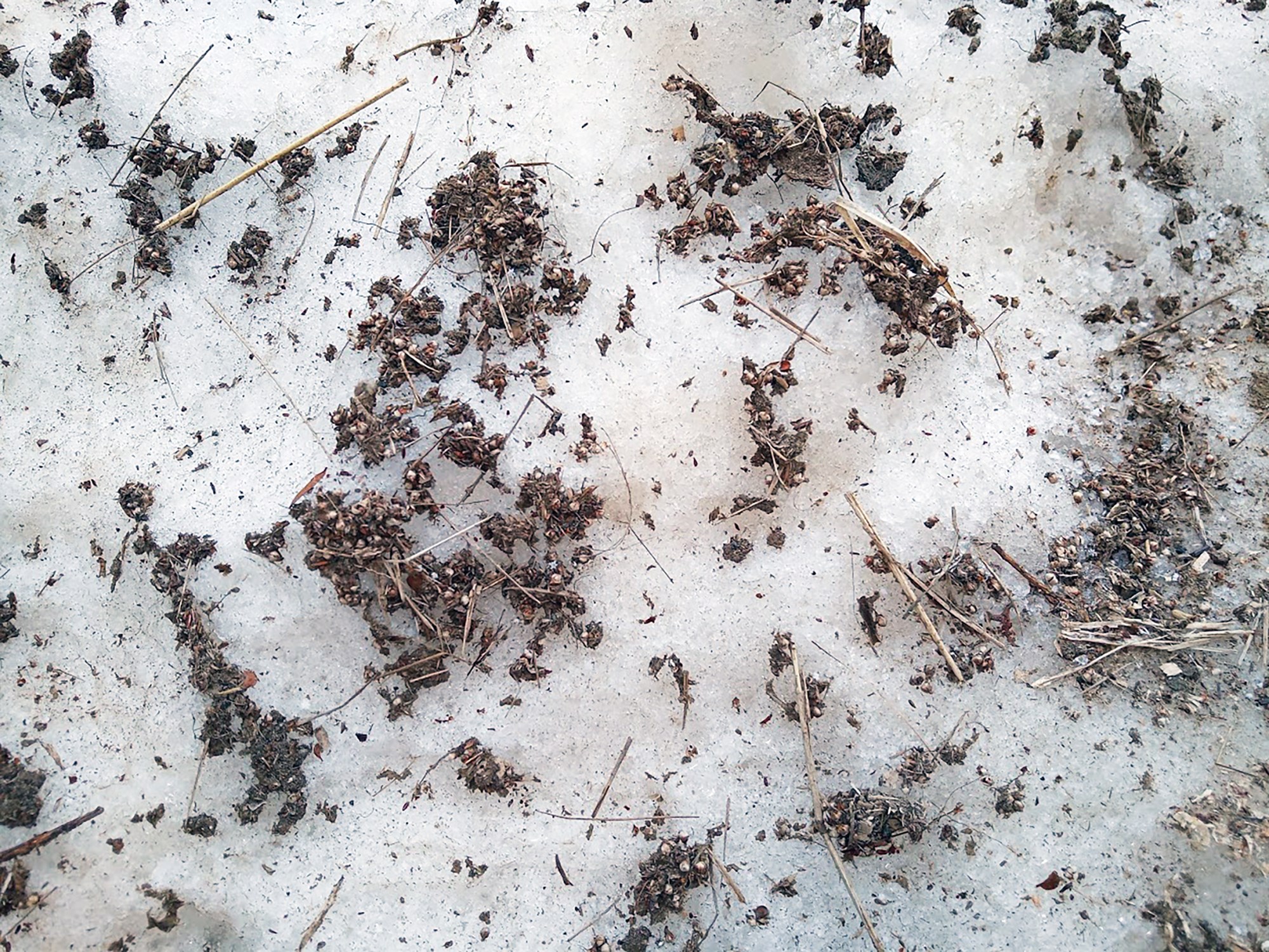 Í áfoki á snjó má greina fræbjöllur af beitilyngi.